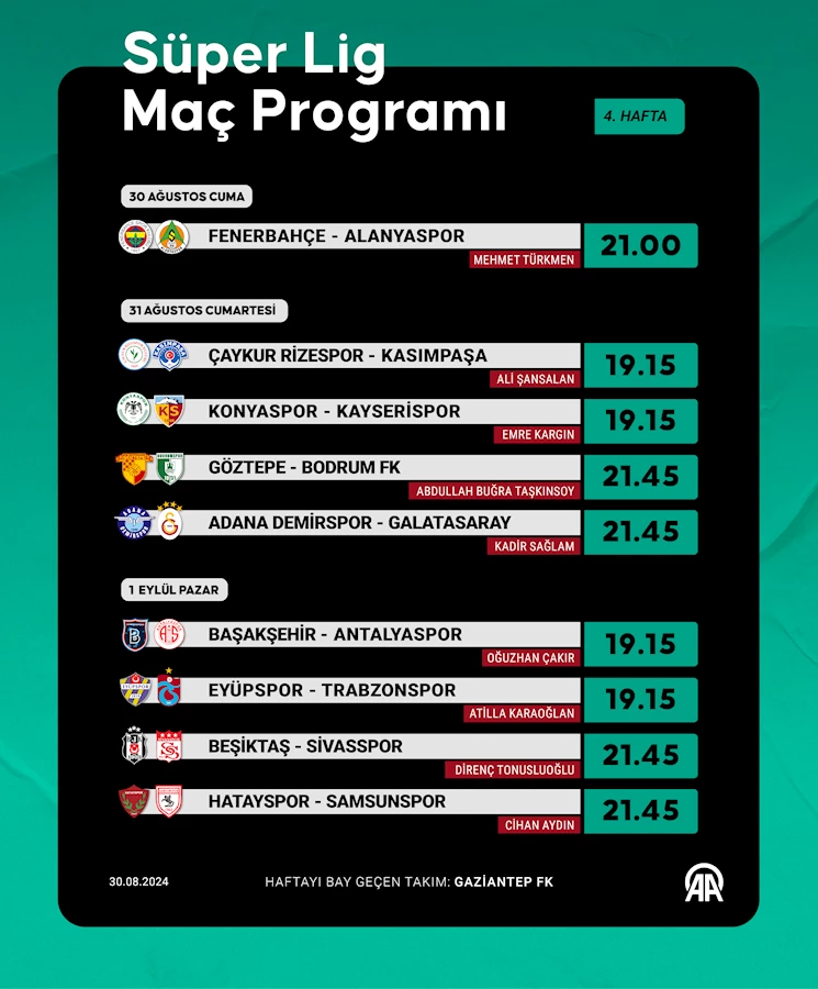 İSTANBUL (AA) - Futbolda Trendyol Süper Lig ve Trendyol 1. Lig'de 4. hafta, TFF 2. Lig'de ise 1. hafta müsabakaları oynanacak.