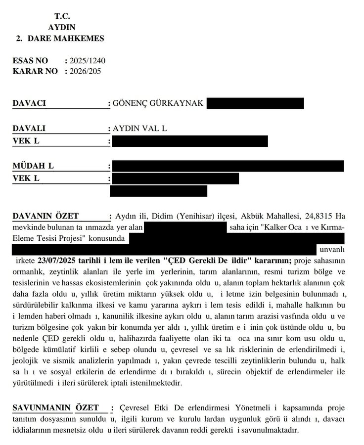 1.Akbük’te yer alan saha için yapılması planlanan “kalker ocağı ve kırma-eleme tesisi projesi” kapsamında Aydın Valiliği 23.07.2025 tarihinde ÇED Gerekli Değildir kararı vermişti. Proje sahasının ormanın, tarım alanlarının ve yerleşim yerlerinin yakınında bulunduğu, proje kapsamında hukuki gereklerin usulüne uygun şekilde yerine getirilmediği, jeolojik, sismik ve halk üzerindeki etkilerinin yeterince analiz edilmediği ve özetle Valiliğin işleminde kamu yararı olmadığından bahisle bu kararı yargı yoluna taşımıştım.