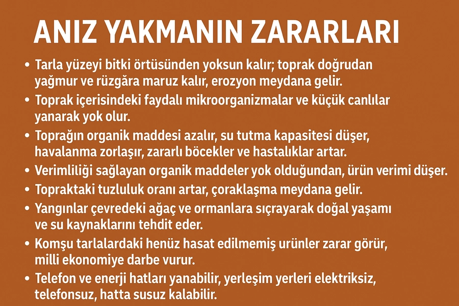 Yetkililer, anız yakmanın tarımsal üretime, çevreye ve canlı yaşamına telafisi güç zararlar verdiğini belirterek, toprağın verimliliğini korumak için alternatif yöntemlerin kullanılmasını önerdi. Açıklamada, anız yakmanın; toprağın organik yapısını bozduğu, faydalı mikroorganizmaları yok ettiği, erozyonu hızlandırdığı ve hava kirliliğine neden olduğu vurgulandı.