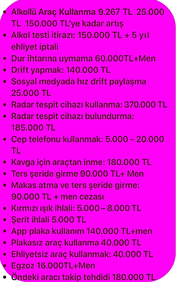 * Radar tespit cihazı bulundurma: 185.000 TL