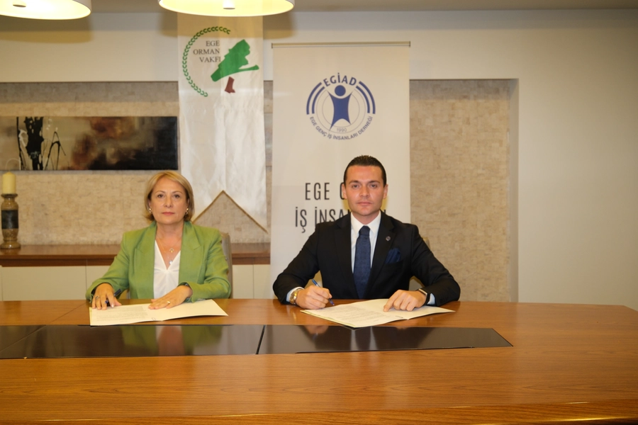 EGİAD Yönetim Kurulu Başkanı M. Kaan Özhelvacı ve Ege Orman Vakfı Genel Müdürü Perihan Öztürk tarafından imzalanan protokol törenine EGİAD yönetim kurulu üyeleri ve vakıf temsilcileri katıldı.
