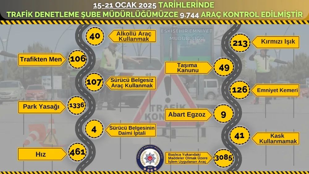 Eskişehir Emniyet Müdürlüğü Trafik Denetleme Şube Müdürlüğü ekipleri tarafından 15-21 Ocak tarihleri arasında yoğun bir trafik denetimi gerçekleştirildi. Bu kapsamda 9.744 araç kontrol edildi. Denetimler sonucunda 40 sürücü alkollü araç kullanırken yakalandı, 107 sürücü ise sürücü belgesi olmadan araç kullandı.