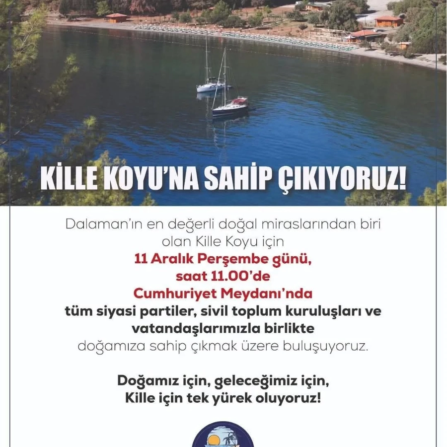 “Muğla’nın Dalaman ilçesinde en değerli doğal miraslarından biri olan Kille Koyu için 11 Aralık Perşembe günü, saat 11.00'de Cumhuriyet Meydanı'nda tüm siyasi partiler, sivil toplum kuruluşları ve vatandaşlarımızla birlikte doğamıza sahip çıkmak üzere buluşuyoruz.