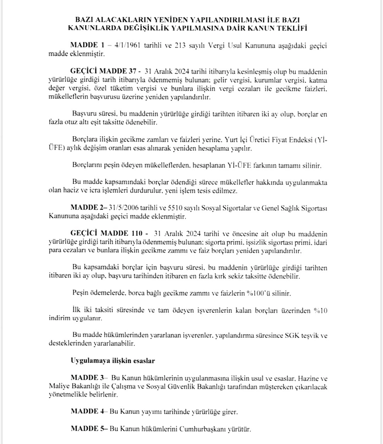 * 31 Aralık 2024 itibarıyla kesinleşmiş vergi ve SGK borçları yeniden yapılandırılacak.
