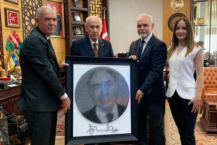 MHP İl Bakşanlığından yapılan açıklamaya göre, İl Başkanı Candemir'in, Bahçeli'ye el işçiliği ile özel olarak hazırlanan Alparslan Türkeş portesini hediye ettiği belirtildi.