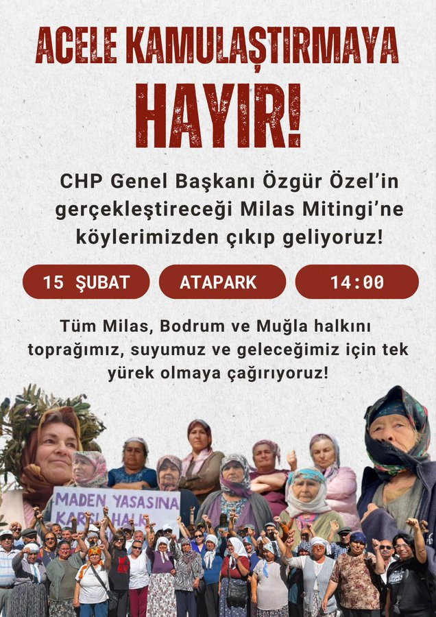 Acele kamulaştırmaya karşı yurttaşlar 15 Şubat 2026 Pazar günü saat 14.00’te Milas Atapark’ta miting düzenleyecek. İkizköylülerin avukatlarından İpek Sarıca, hukuk mücadelesinin kararlılıkla sürdürüleceğini açıkladı.