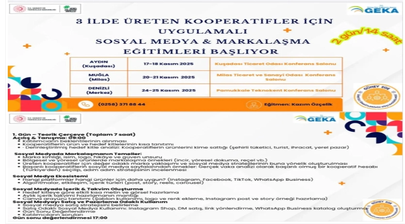 Üreten kooperatiflerin dijital görünürlüğünü artırmak ve markalaşma süreçlerine katkı sunmak amacıyla düzenlenen Uygulamalı Sosyal Medya & Markalaşma Eğitimleri, 20–21 Kasım 2025 tarihlerinde Muğla Milas Ticaret ve Sanayi Odası Konferans Salonu’nda gerçekleştirilecek. Eğitmen Kazım Özçelik tarafından verilecek 2 günlük, 14 saatlik kapsamlı program; sosyal medyada etkili iletişim kurmanın yollarını katılımcılara uygulamalı olarak aktaracak.