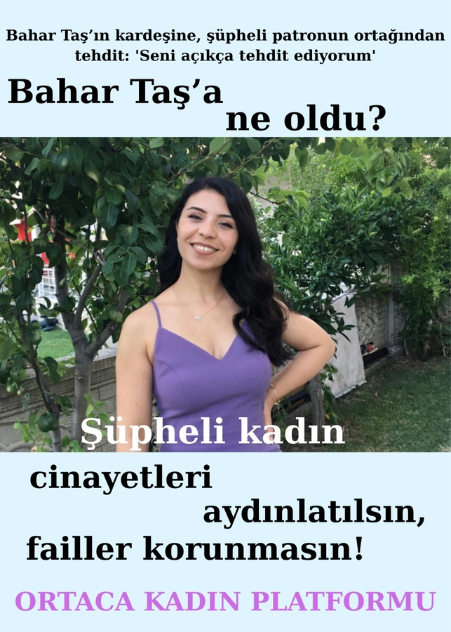 Kadın platformu açıklamasını “Bahar Taş’a ne oldu?” sorusuyla tamamlayarak sürecin takipçisi olacaklarını duyurdu. Olayla ilgili adli sürecin sürdüğü ve yeni gelişmelerin beklendiği öğrenildi.